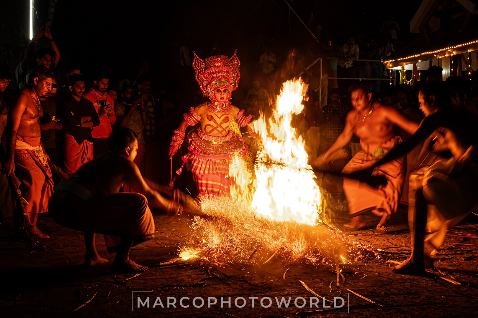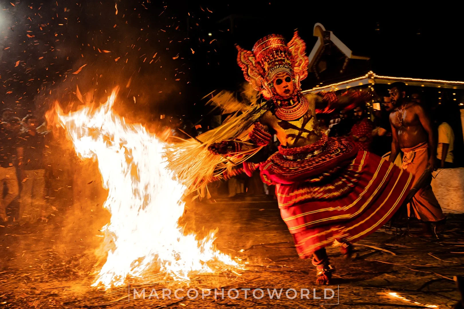 Some Theyyam rituals even include animal sacrifices, like chickens, to honor the spirits.